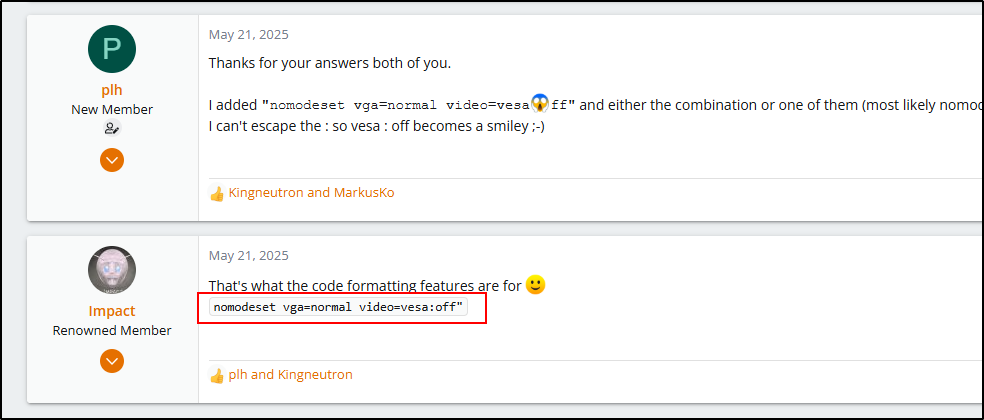安裝新的 pve 9 一直出現當機,無法很順利進行開機步驟,我覺得是顯卡壞了,於是花了很多時間換顯卡,還是不行,後來又換成 pve 8,也不OK,最後改成 pve 7 就可以安裝了,事後我爬文,應該是主機 CPU 是 AMD Ryzen 9 5900X 造成的,解法如下: